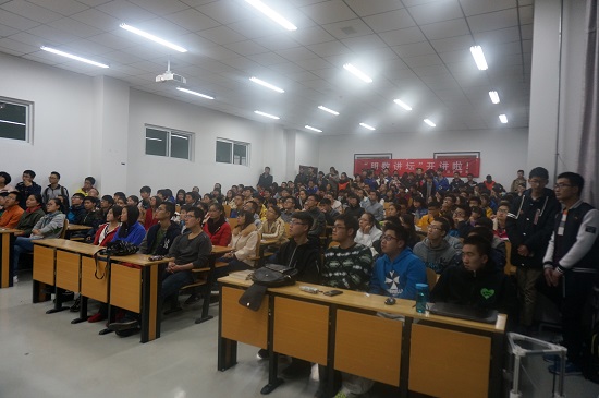 晚上七点,讲座准时开始,首先由李一迪介绍了团队历次参加比赛所获荣誉;接着四位同学逐一介绍了四个项目,分别是慧鱼、水鱼、非标和3D打印机技术。尽管教室场地有限,但同学们的热情十分高涨,以认真积极的态度听完了整场讲座。最后机器人团队与参加讲座的同学进行了热烈的现场互动。
