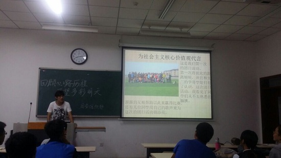 14级的活动由组织部副部长李志迪主持,共分为4个板块,重览团日活动、团支汇报总结、回顾心路历程、展望多彩明天。各班团支书依次上台发言,反思去年团日活动的不足之处,提出在新的学期中要坚决杜绝走形式的行为,形式多样化,号召全体同学参与,让同学们从思想上有所改变。活动期间,校艺术团的罗驰同学为大家献唱一曲,现场气氛热烈起来,同学们参与其中,之后又以击鼓传花的方式,选出学生代表总结自己的大一生活,并对新学期进行规划。